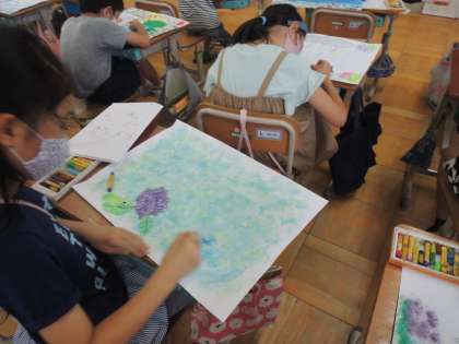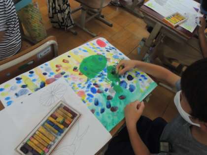 画用紙に「6月の音」をイメージして絵絵の具で表現しました。その後クレパスで生き物や植物を描いていきました。完成までもう少しです!