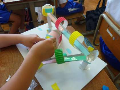 図工科の学習では,「コロコロガーレ」というビー玉が転がる仕組みを考えてコース作りをしています。