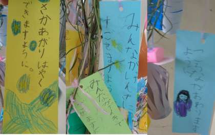7月(文月)は,七夕に文や願いを捧げる月と言われています。1年生の短冊には,「ひらがながうまくかけますように」「さかあがりがうまくできますように」「すいえいがんばります」など自分の願い事や「みんなげんきにすごせますように」「ころながおわりますように」など,まわりのことを考えた願い事もあり,感心しました。