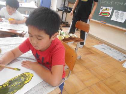 なつやさいが沢山出てくる本です。読んだ後,実物の野菜を見ながら筆ペンと水彩絵の具を使って絵を描きました。とっても素敵な絵が描けました。