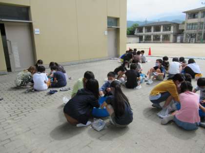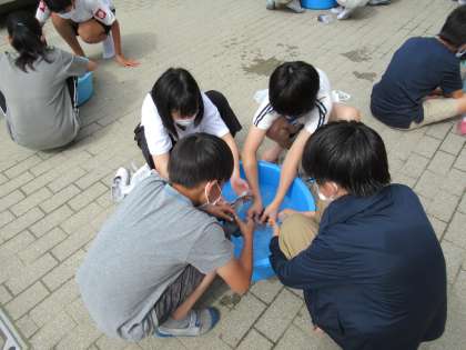 家庭科の学習で洗たくをしました。桶に水をためて洗剤を溶かし,手洗いでくつ下を洗いました。もみ洗い,つまみ洗い,すすぎを行い,自分たちの手できれいにすることができました。いつもは洗濯機にしてもらっている洗たく。これから汚れに合わせて自分たちでも洗たくできるといいですね。
