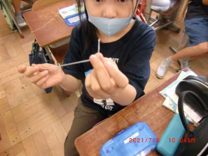 針に糸を通し,玉結び・玉どめに挑戦!まだまだ慣れない手つきですが,あきらめずに頑張る子どもたちです。うまくできたときには大喜び。
