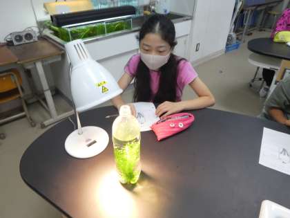 「オオカナダモ」という水草に,人工の光を当てて,水草からあわが出る様子を観察しました。