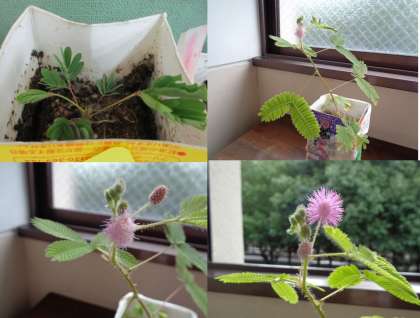 7月に6組児童からもらった「おじぎ草」が大きくなって花を咲かせました。校長室の前で育てています。眺めているととてもリラックスできます。