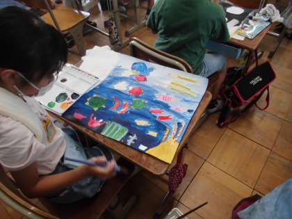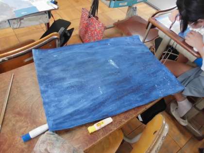 図工科の学習では,お話を聞いて思い浮かべた情景を絵で表現しています。色の濃さや塗り方を工夫して表現することができています。