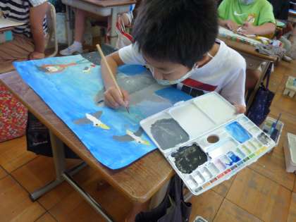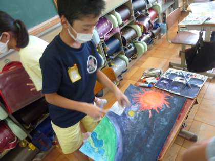 子どもたちは,「色を重ねたり,グラデーションにしたりするといい感じになったよ。」と,絵を描くことの楽しさ,面白さを感じながら取り組んでいました。