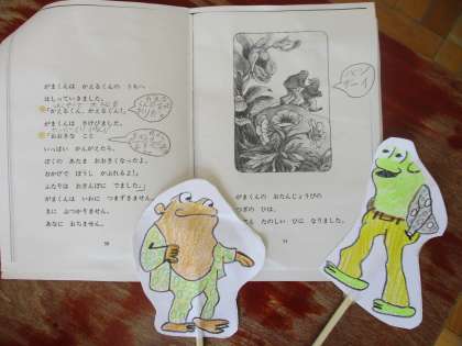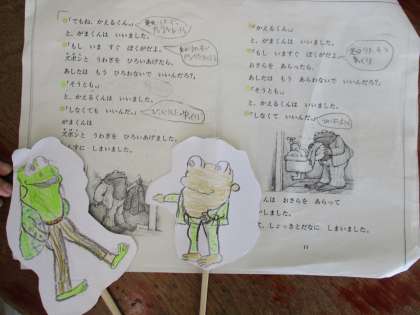 ペープサートを使って音読発表をしています。