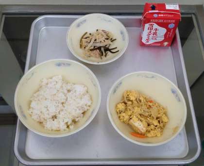 今日は沖縄の郷土料理であるチャンプルとクーブイリチーが給食に登場しました。