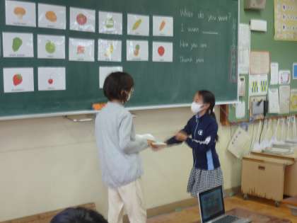 食材の言い方を覚えたり,「What do you want?」「I want peach.」とほしいものを尋ねたり,答えたりして,外国語活動に親しみました。