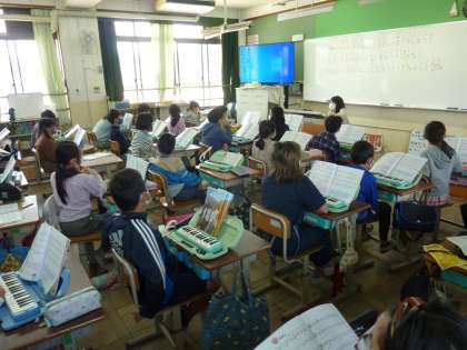 音楽科では,「せんりつの重なりを感じ取ろう」という学習を行っています。