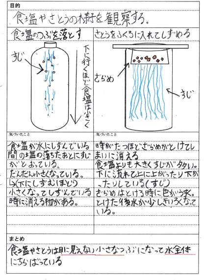 実際に食塩やさとうが水にとけていく様子をくわしく観察しました。