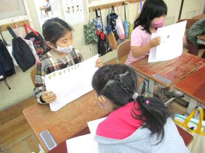 3枚の画用紙に問題の挿絵や問題文をかき,友だちと交流することができました。