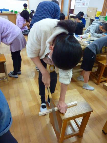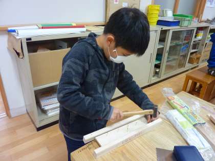 のこぎりで木を切ることに少し苦労をしながらも,段々と作品ができあがってくると「見て!できてきたよ!」と嬉しそうにしていました。