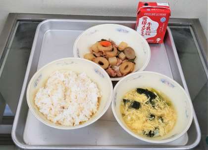 今日の給食では昔から福岡県の北部(筑前)で食べられてきた筑前煮が登場しました。