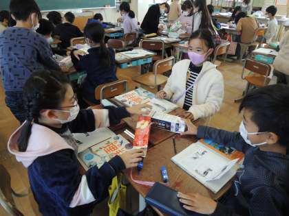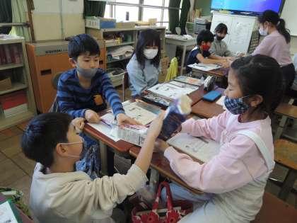 骨,間接の学習の次はいよいよ筋肉・・・“先生!今日は筋肉の勉強やんな!?”とやる気満々の人がいて嬉しく思いました。腕を曲げたり,伸ばしたりするとき,筋肉は「のびる」のか「ちぢむ」のか,大人でも時々どっちだったかな?と迷うことがあります。自分の腕を触っても分かりにくいので,牛乳パックで模型を作って調べました。すると筋肉(赤・青のテープ)の「のび」「ちぢみ」をしっかり確かめることができました。