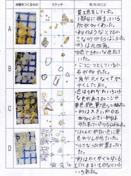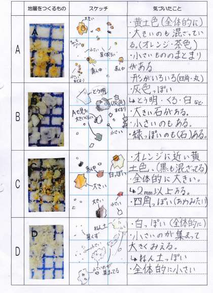 それぞれの地層に含まれるどろ・砂・れきの粒の大きさや色などを調べました。