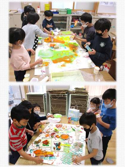 「カップ持ってきた!」「パックの底の形がおもしろかった!」など,自分が持ってきた材料を使って楽しく活動することができました。