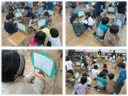 みんながつくった木が集まると,いつもの教室が「おはなしの森」になりました。