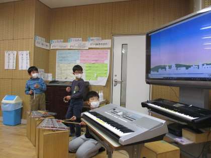 アニメーションをもとに,楽器の鳴らし方や音の強さ,鳴らす順番などをグループで考え,一つの音楽として表現する活動に取り組みました。