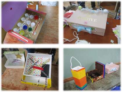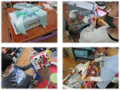 おうちから持ってきた空き箱や紙袋に,入れるものをイメージした飾りつけをしました。
