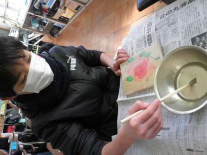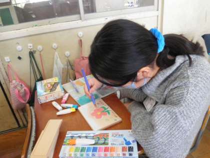 目立たせたいところを彫刻刀で彫り,色付けをする表情は真剣そのものでした。