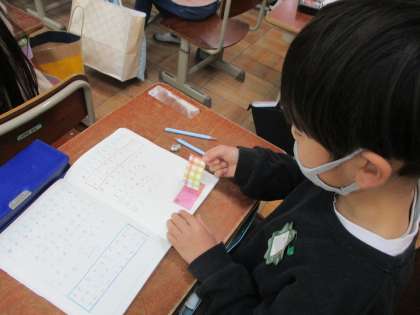 どちらのシートが広いか予想を立て,実際に重ねて比べてみました。