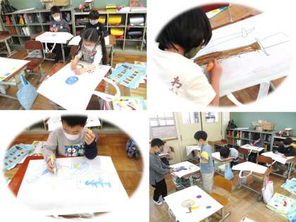 1年間の図画工作科の学習を振り返りながら,これまでの作品をまとめたり,作品バッグに色をつけたりして過ごしました。