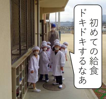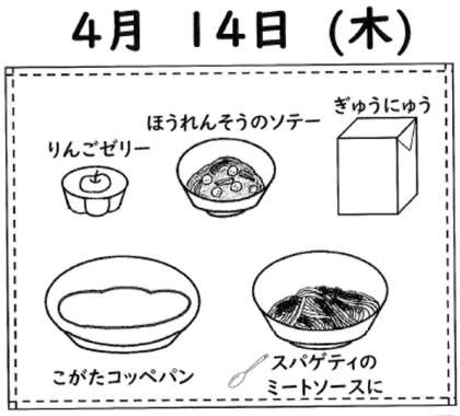 給食が始まりました。メニューは子どもたちが大好きなスパゲティです。ほうれん草のソティも人気があります。1年生は,戸惑いながらも,給食当番をこなして,初めての給食をおいしくいただきました。