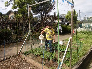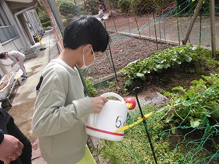 畑の野菜に水やりをしました。そのあと,また春見つけをしました。
