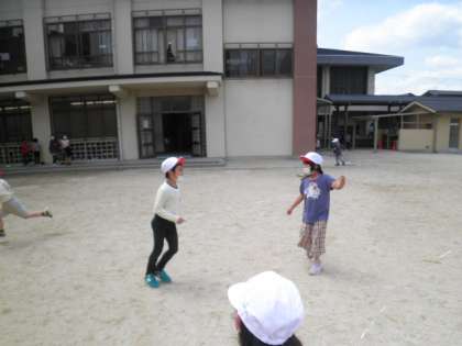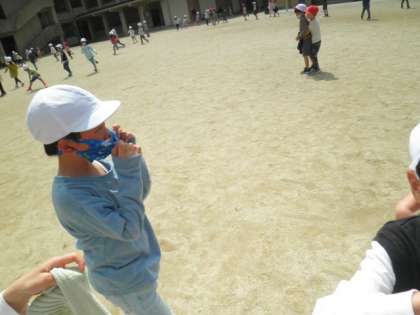まずは,他の学年がそうじをしている時間を使って,1年生だけで運動場を使います。