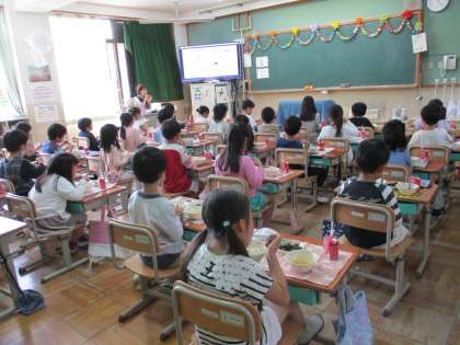 1年生のみなさんがとてもよいしせいで食べていました。とてもすてきですね。おはしをいっしょうけんめいつかって,しょっきをピカピカにしようとするすがたや,にがてなものもがんばってたべようとするすがたが見られて,ひ口先生はとてもうれしかったです。あしたのきゅうしょくもたのしみですね♪