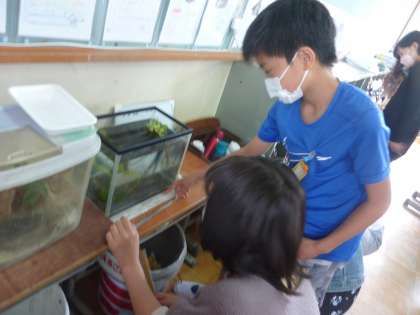 身の回りにある教室や水槽などの体積を測っている様子です。