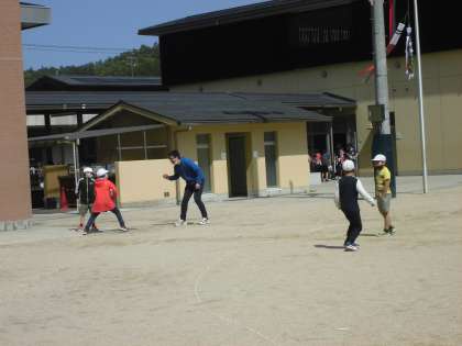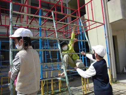 みんなで外で運動をしました。滑り台も安全を考えて遊んでいます。鬼ごっこは,みんなですると,笑顔があふれていました。