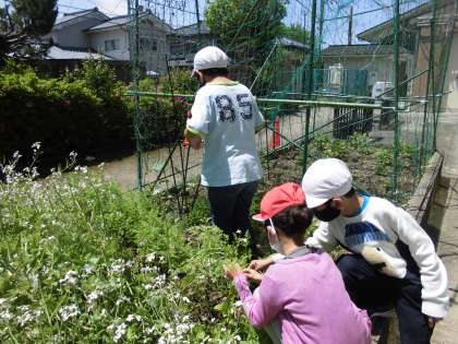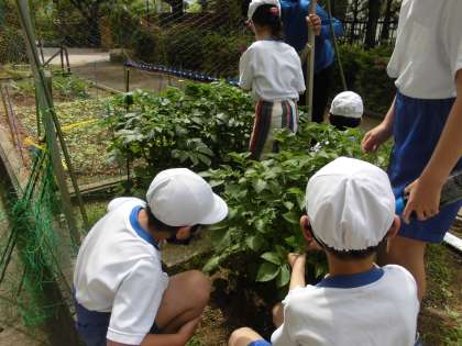 おいしいジャガイモができますように。と願いをこめて,ニジュウヤホシテントウを駆除したり,花をつんだりしています。