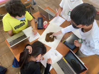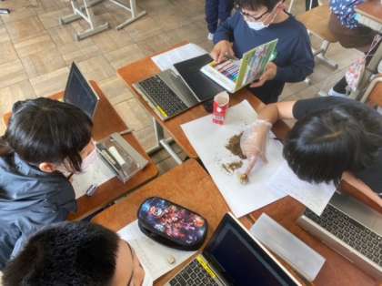 カブトムシの幼虫の様子を観察するために,幼虫を触って確かめることもしました。幼虫を傷つけないように,優しくそっと触っていました。「ドキドキする!」「思ったよりもぷにぷにしていた!」と恐る恐る触りながら,分かったことをワークシートに書き込んでいました。