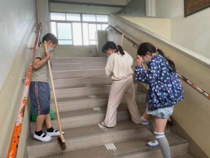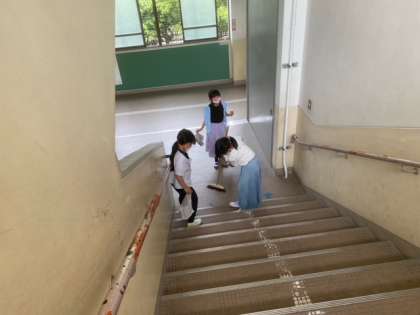 昼休みが終わるとすぐにほうきやぞうきんを持ってそうじを始めています。「そこにごみあるよ。」「ちょっとそっち持って。」と互いに声をかけ合い,協力してそうじをしています。