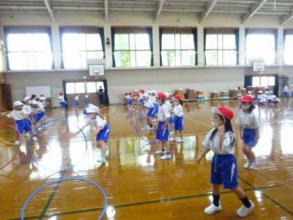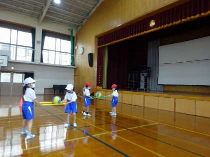 体育館で「用具遊び」をしました。フープと棒を使い,いろいろな運動をしました。「こうしたらうまくできるよ。」とアドバイスしあう様子が見られました。