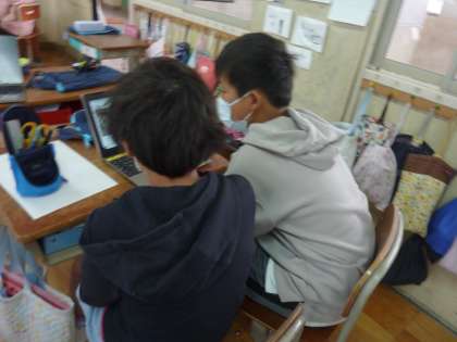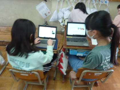 総合的な学習では,防災について調べ学習を行っています。学級を超えて学年で同じテーマを選んだ人とグループになり,調べて分かったことをパワーポイントやロイロノート,紙芝居などにまとめ,発表に向けて準備を進めています。