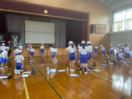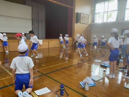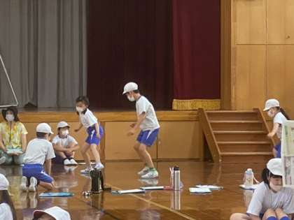 20秒間に横跳びが何回できるかに挑戦です。「方向を変えて反対側に跳ぶのが難しい!」「がんばれ!」と応援し合いながら取り組みました。