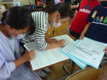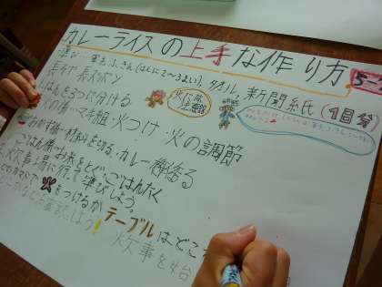 作るカレーの作り方を調べ,画用紙にまとめています。「みんなで美味しいカレーを作るぞ!」と意気込んでいます。
