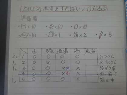 条件表を作り,それをもとにして,実験方法を話し合いました。