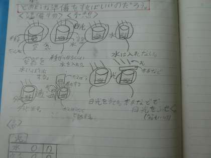 植物の発芽の条件を調べるための実験計画を話し合いました。