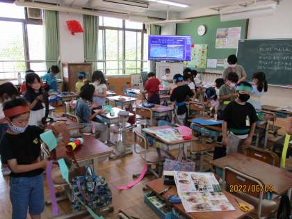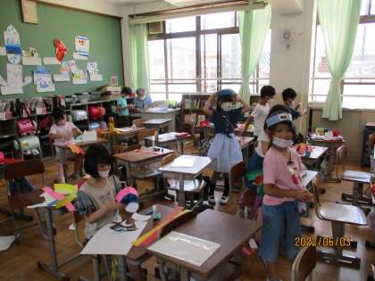 3日(金)の図画工作科の学習で,色画用紙やホチキスを使って「わっか」を作り,様々な姿に変身しました。体にわっかをつけて,王冠やベルト,スカートにしたり,わっかをうまく使ってうさぎやねこ,カエルを作ったりもしました。また,カラーテープやクレパスをうまく使って飾りつけも上手にしていました。