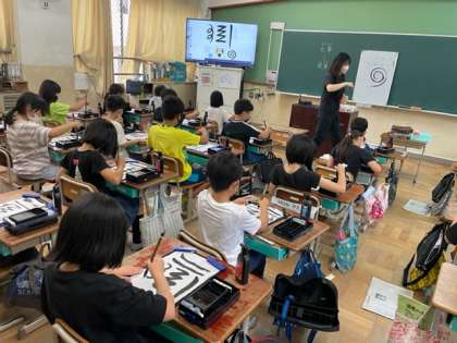 はじめての毛筆。鉛筆とはちがって,とっても柔らかい筆に興味津々の子どもたち。筆を立てて,「すーっ」と言いながら,まずは力強い線を引きます。「はやく筆でいろんな字を書きたい!!」とやる気いっぱいでした。