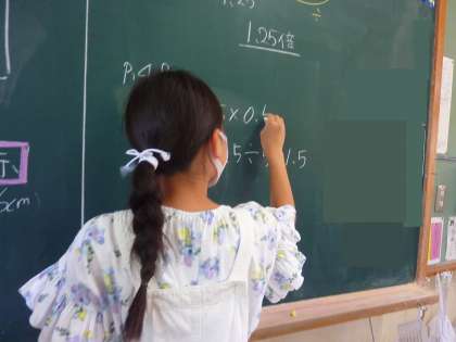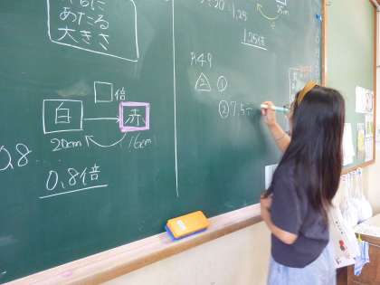 算数科「小数のかけ算」について学習している様子です。ある量を1としたときの,大きさの表し方について考えました。子どもたちは,「関係図を使うと式がたてられます。」など,4年生での学習を活かして考えていました。