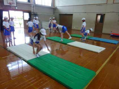 体育科ではマット運動を行っています。1時間目では,自分ができる技を練習し,今日は挑戦したい技に取り組みました。「先生,後転を教えてください!」「側転のこつは何ですか?」と,子どもたちは意欲的に挑戦しています。