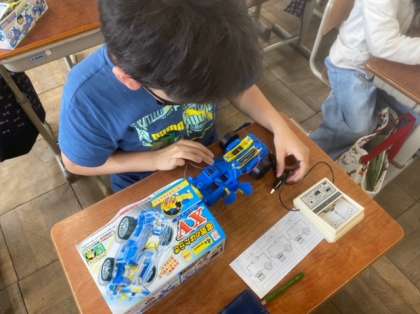 理科「電池のはたらき」乾電池のつなぎ方と,モーターの回る速さや豆電球の明るさの関係を簡易検流計を使って調べました。乾電池の数を変えたり,つなぎ方を変えたりして電流の大きさを調べました。