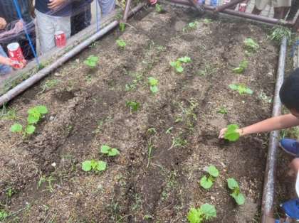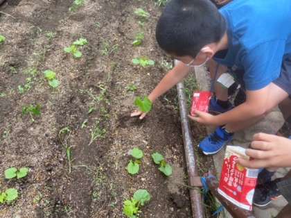理科「季節と生き物」の学習で育てているツルレイシを畑へ植えかえました。これからどのように成長していくのか楽しみです。