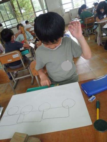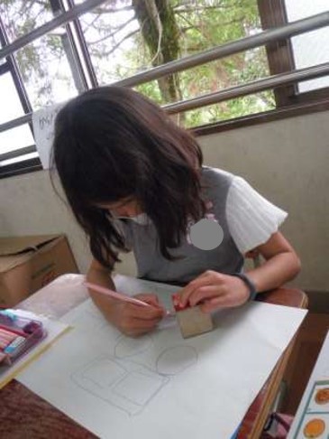 算数科の「いろいろなかたち」の学習で,かたちうつしをしました。四角,三角,丸のつみきを使って,形を組み合わせて描きます。家,木,うさぎ,かさ,てるてるぼうずなど,想像力豊かに描いていました。