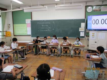 6日の学級活動の時間に,クラスをよりよくしようというテーマで「学級会」を開きました。2年生のクラスで2か月間を過ごしてみて「困っていることはないか」「クラスにこんなルールがあったほうがいい」という2つのお題でクラスみんなで話し合いました。話し合うお題と進め方は準備しましたが,そのほかは議長,副議長,書記を選出して,子ども達が主体で立派に話し合いを進めていました。「やらなけらばならないことをしてから楽しいことをしよう」「タイマーの時間をしっかり守ろう」というルールがあったほうがいいという意見が出てきました。